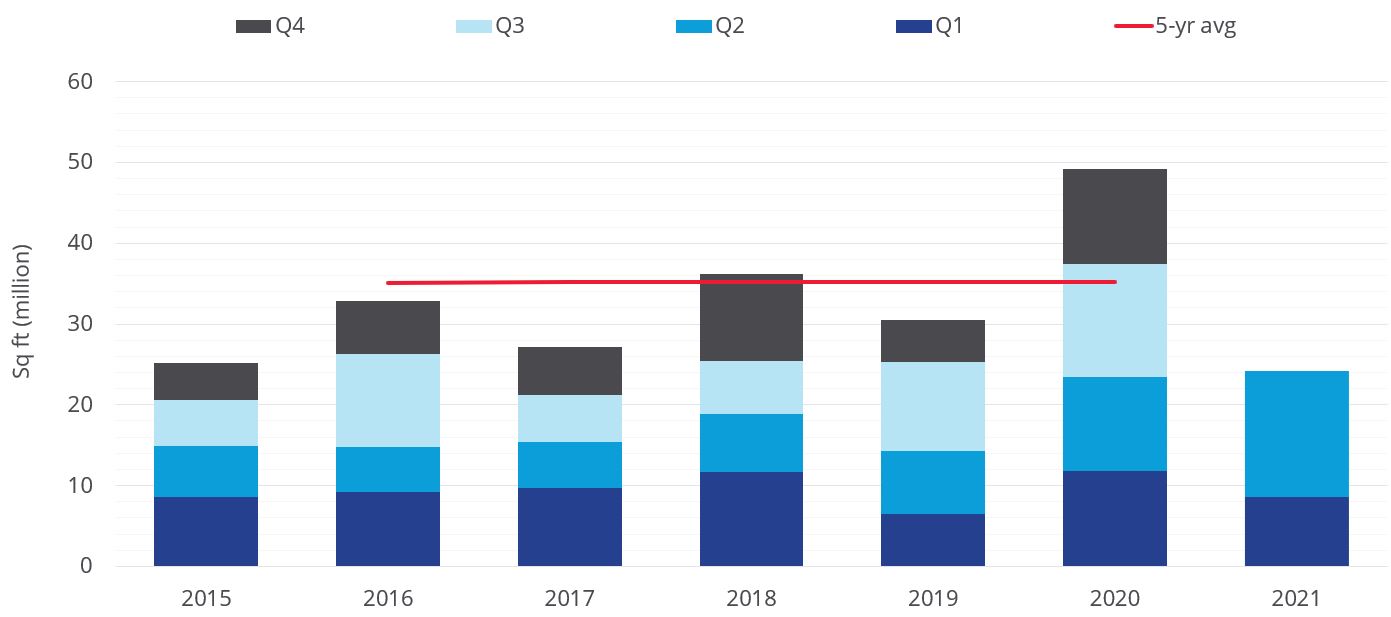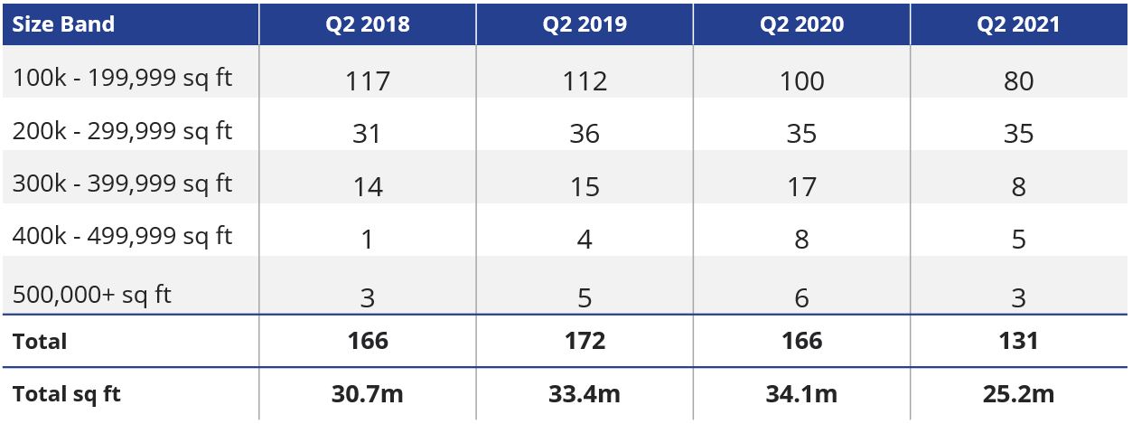 Given the extraordinary demand that we have witnessed over the past 18 months, Q2 supply is down 26% year-on-year to stand at 25.2 million sq ft. Despite these figures, which include speculative warehouse space due for practical completion by the end of Q3, the market currently exhibits the lowest level of availability on record. This equates to a vacancy rate of 4.3%. When analysing supply by number of unit and size band, only three warehouses over 500,000 sq ft are available (compared to six in Q2 20), and 80 assets in the 100-199,000 sq ft bracket on the market (compared to 100 in Q2 20).
