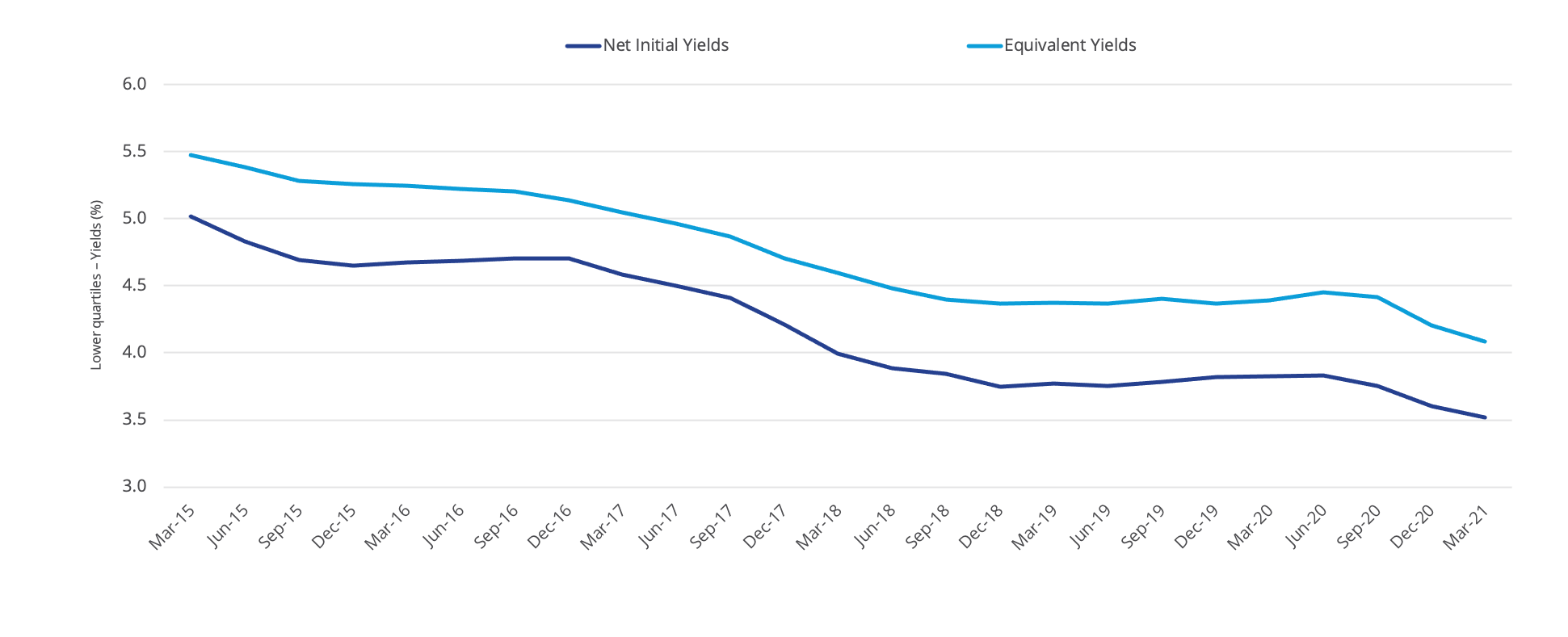 This strong buyer appetite continues to fuel further yields compression nationally. The latest quarterly MSCI data for Q1 2021, shows the lower MSCI quartile national net initial yield and equivalent yield at 3.6% (-9 bps q/q) and 4.1% (-12 bps q/q), respectively. We expect further yield compression over the next eight to 12 months due to accommodative monetary policy and strong buyer competition chasing limited opportunities.